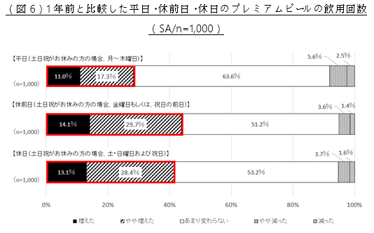 1年前と比較して、平日・休前日・休日のプレミアムビールの飲用回数の変化を質問したところ、すべてのタイミングにおいて、飲用回数が増えたと回答した人(平日(28.3%)・休前日(43.8%)・休日(41.5%))が、減ったと回答した人を上回りました(図6)。特に休前日は増えたと回答した人が43.8%と、調査開始以来過去最高となりました。
