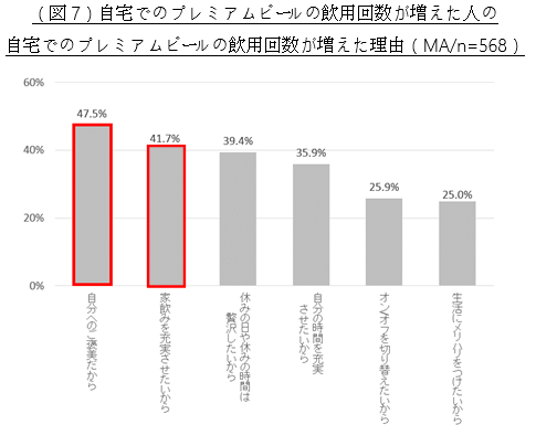 また、自宅でのプレミアムビールの飲用回数が増えた人に、その理由を質問したところ、「自分へのご褒美だから(47.5%)」「家飲みを充実させたいから(41.7%)」が上位になりました(図7)。外でお酒を飲む機会が減っている中、家飲みを充実させるお酒としてプレミアムビールが選ばれているようです。