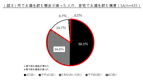 外でお酒を飲む機会が減ったと回答した人に、自宅でお酒を飲む頻度の変化について質問したところ、84.1%が自宅でお酒を飲む機会が増えたと回答しました(図8)。