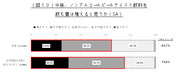 ノンアルコールビールテイスト飲料を飲む量が、今後増えると思うかを質問したところ、64.7%が「増えそう」(「増えそう」(24.6%)、「やや増えそう」(40.1%)の合計)と回答しました。特に「ノンアルコールビールテイスト飲料は、在宅時間の充実に役立っている」と回答した人(986人)では、74.9%が「増えそう」と回答しました(図10)。ノンアルコールビールテイスト飲料へのニーズは高まっているようです。