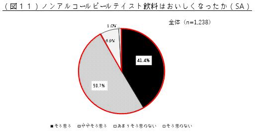 ノンアルコールビールテイスト飲料の味について、最近おいしくなったかを質問したところ、9割以上(92.1%)が「おいしくなった」(「そう思う」(41.4%)、「ややそう思う」(50.7%)の合計)と回答しました(図11)。
