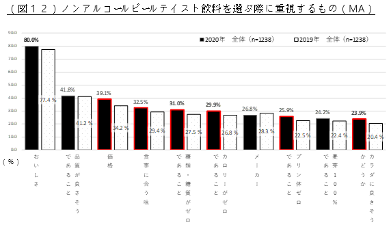 ノンアルコールビールテイスト飲料を選ぶ際に重視する点の1位は、「おいしさ」(80.0%)でした。また、「価格」(39.1%)、「食事に合う味」(32.5%)とともに、「糖類・糖質ゼロ」(31.0%)、「カロリーゼロ」(29.9%)、「プリン体ゼロ」(25.9%)、「カラダに良さそうかどうか」(23.9%)は昨年に比べ3ポイント以上上昇しており、健康面を意識してノンアルコールビールテイスト飲料を選ぶ人が増えているようです(図12)。