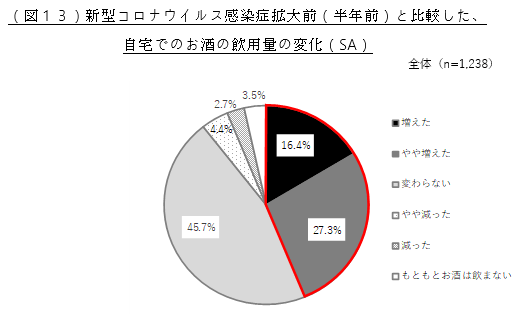 新型コロナウイルス感染症拡大前(半年前)と比較した、自宅でのお酒の飲用量の変化を質問したところ、4割以上(43.7%)が「自宅でのお酒の飲用量が増えた」(「増えた」(16.4%)、「やや増えた」(27.3%)の合計)と回答しました(図13)。