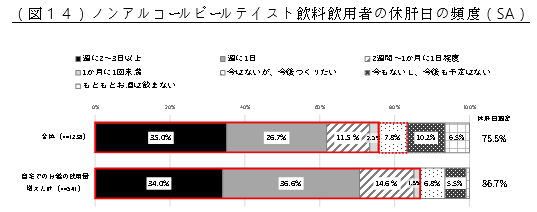飲用者の約4人に3人が日常生活の中で休肝日を設定。休肝日の飲み物としてノンアルコールビールテイスト飲料が定着。