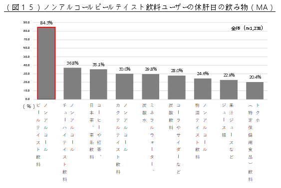 ノンアルコールビールテイスト飲料の飲用者に、休肝日に飲んでいる飲み物を質問したところ、「ノンアルコールビールテイスト飲料」(84.3%)が最も多く、「コーヒーや紅茶、日本茶、茶系飲料」(35.1%)、「ミネラルウォーター、炭酸水」(29.8%)といったお茶や水より高い割合でノンアルコールビールテイスト飲料が選ばれていました。ノンアルコールビールテイスト飲料は、休肝日の飲み物として定着しているようです(図15)。