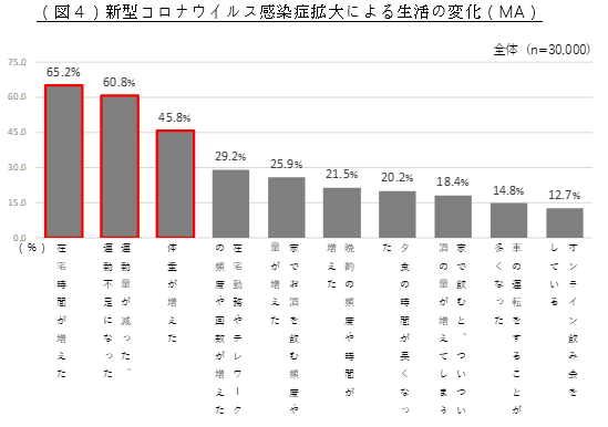 新型コロナウイルス感染症拡大による生活の変化を質問したところ、「在宅時間が増えた」(65.2%)、「運動量が減った、運動不足になった」(60.8%)と回答した人が6割以上となりました。また、約半数(45.8%)が「体重が増えた」と回答しました(図4)。