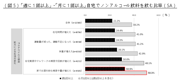 新型コロナウイルス感染症拡大によって生活に変化があった人(図4、変化がみられた上位5項目)の飲用頻度をみると、「家でお酒を飲む頻度や量が増えた」人(4,505人)では、ノンアルコール飲料を週1回以上飲んでいる人が3割(32.5%)、月1回以上飲んでいる人が5割(50.3%)を超えており、飲用頻度が高くなっているようです(図5)。