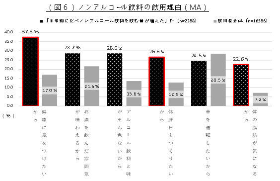 ノンアルコール飲料の飲用理由について質問したところ、「半年前に比べノンアルコール飲料を飲む量が増えた」人(2,388人)は「健康に気をつけたいから」(37.5%)、「休肝日をつくりたいから」(26.6%)、「体の脂肪が気になるから」(22.6%)と、全体に比べ回答した割合が高く、健康面を意識してノンアルコール飲料を選んでいることがわかりました(図6)。
