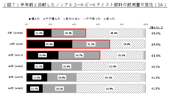 半年前と比較したノンアルコールビールテイスト飲料の飲用量の変化を質問したところ、約半数(49.4%)が「増えた」と回答しました。特に20代(69.9%)は約7割、30代(61.6%)は約6割が「増えた」と回答しており、比較的若い層でノンアルコールビールテイスト飲料の飲用量が増えているようです(図7)。