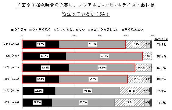新型コロナウイルス感染症拡大によって在宅時間が増えた人が多い中、ノンアルコールビールテイスト飲料が在宅時間の充実に役立っているかを質問したところ、約8割(79.6%)が「役立っている」と回答しました。年代別では、20代(92.8%)を筆頭に、30代(87.1%)、40代(80.7%)で8割以上の人が回答しており、多くの人がノンアルコールビールテイスト飲料は在宅時間の充実に役立っていると感じているようです(図9)。