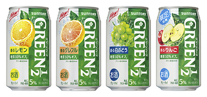 サントリースピリッツ(株)は、「GREEN1/2(グリーンハーフ)〈香るレモン〉」「同〈香るグレフル〉」「同〈香る白ぶどう〉」※1を5月上旬以降順次リニューアルします。また、「同〈香るりんご〉」を6月28日(火)から全国で期間限定新発売します。
