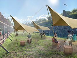 広大なぶどう畑の先に広がる甲府盆地や富士山の景観を眺めながら大自然を堪能いただきたいという思いから開設しました。お客様の好みに応じた思い思いの時間をお過ごしいただけるように、景観を楽しむ「ビューエリア」、ゆっくりとくつろげる「リラックスエリア」、ぶどう畑を中心に自由に散策できる「ファームエリア」で構成されています。