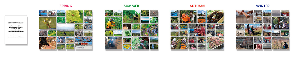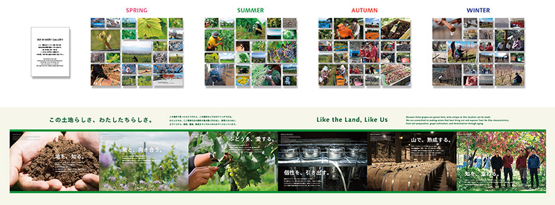 ツアー開始時の集合場所であるレセプションルームでは、ワインづくりのこだわりを展示しています。セミナールームでは、つくり手自身が撮影した季節ごとのワイナリーの写真が展示され、つくり手の顔を感じていただけるような空間を目指しました。