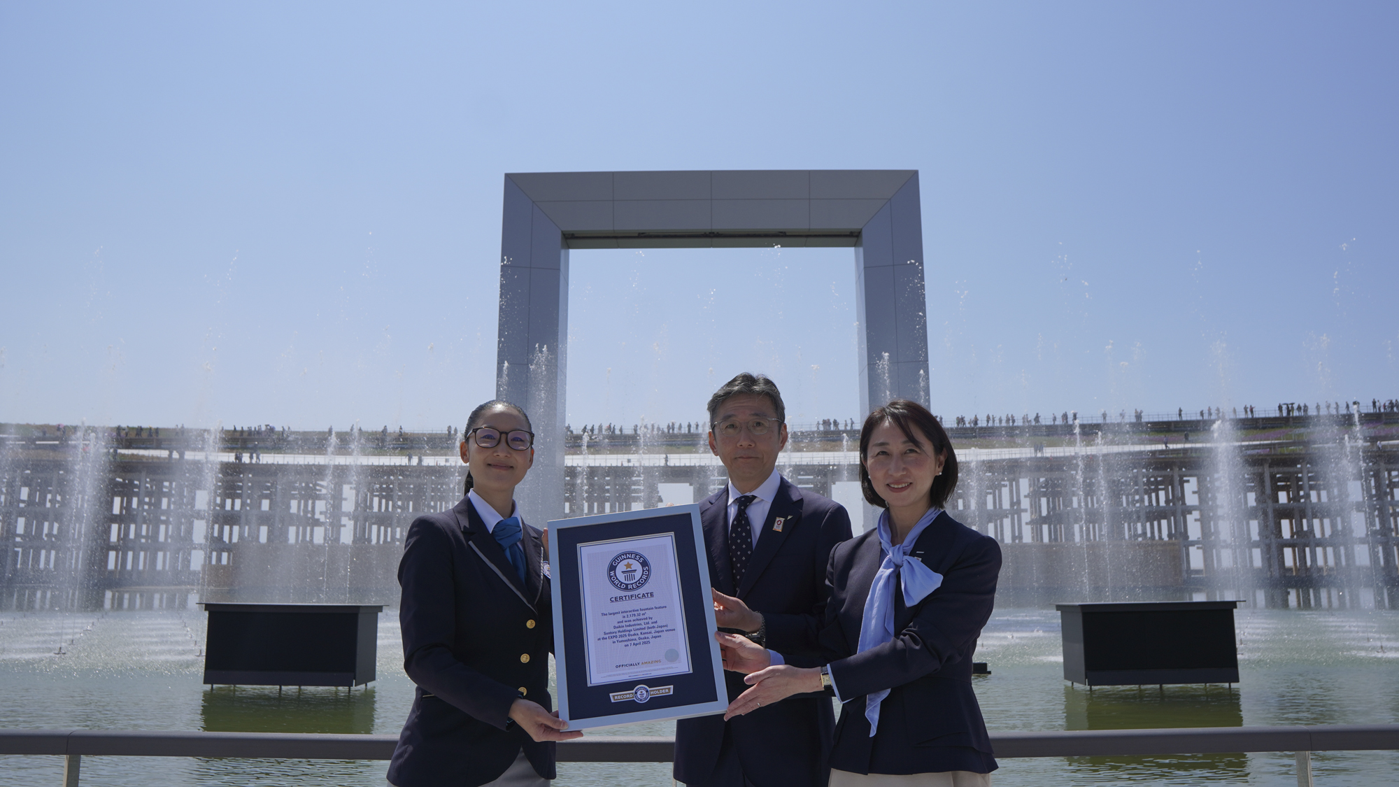 サントリーホールディングス(株)とダイキン工業(株)が、2025年日本国際博覧会(大阪・関西万博)において共同で実施するエンターテインメント「水と空気のマジカルダンス」が、「最大のインタラクティブな噴水設備※1」として2025年4月7日(月)にギネス世界記録™に認定されました。同日、当記録の認定式が万博会場内「ウォータープラザ」で実施され、ギネス世界記録公式認定員から認定証が贈呈されました。