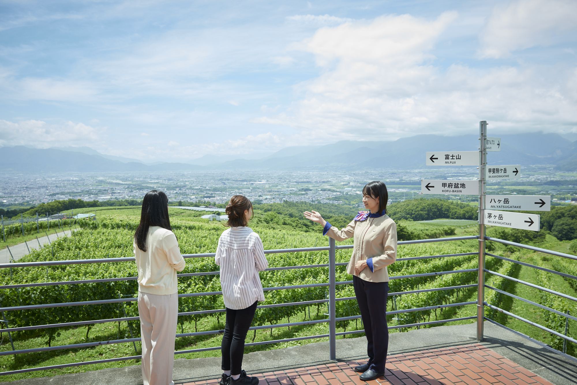 登美の丘ワイナリーの豊かな自然環境を感じながら、つくり手の技、ものづくりにかける情熱と挑戦を体感できるツアーです。案内係と広大な敷地内をバスで移動しながら、まず甲府盆地を見渡せる眺望台からの景色や、ぶどう畑をご覧いただきます。その後、「FROM FARM醸造棟」や熟成庫で、実際の仕込工程の現場を間近でご覧いただきます。見学後は、「SUNTORY FROM FARM 登美の丘 甲州 2022」「同 登美の丘 赤 時のかさね」など、計4種のワインをお楽しみいただけます。