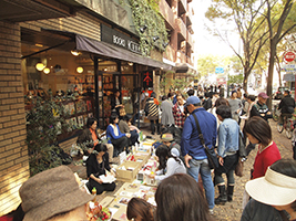 古本市の日は、福岡市の繁華街・天神に隣接する通称「けやき通り」の20数店舗の軒先に、公募で集まった80~100組の「一日書店」が並ぶ。書店主と客の間で本を介して自然と会話が弾み、けやき通りが1年で最も賑わう日となる。
