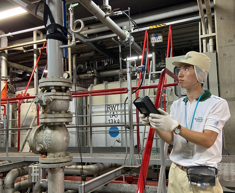 私は、ウイスキー醸造工程における省エネ検討をテーマに行いました。白州蒸溜所では、シングルモルトウイスキー“白州”をはじめとするウイスキーを醸造しています。醸造工程では、主にモルトウイスキーの蒸溜工程で多くのエネルギーを使用し、投入エネルギーの大半を温水として回収しているため、回収温水を最大限有効活用することが重要です。そこで私は、回収温水の使用状況を調査し、ロスの発掘と改善策の提案を行いました。