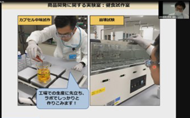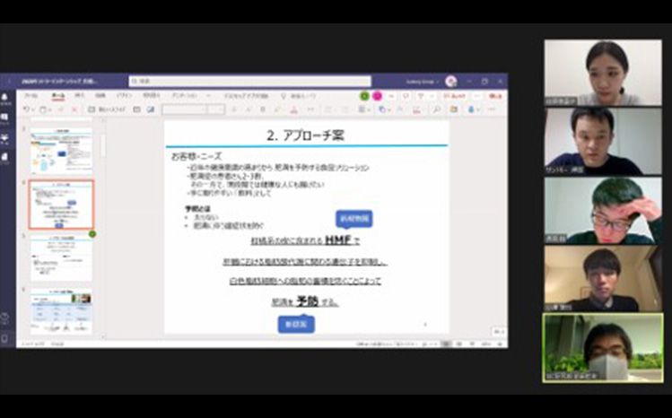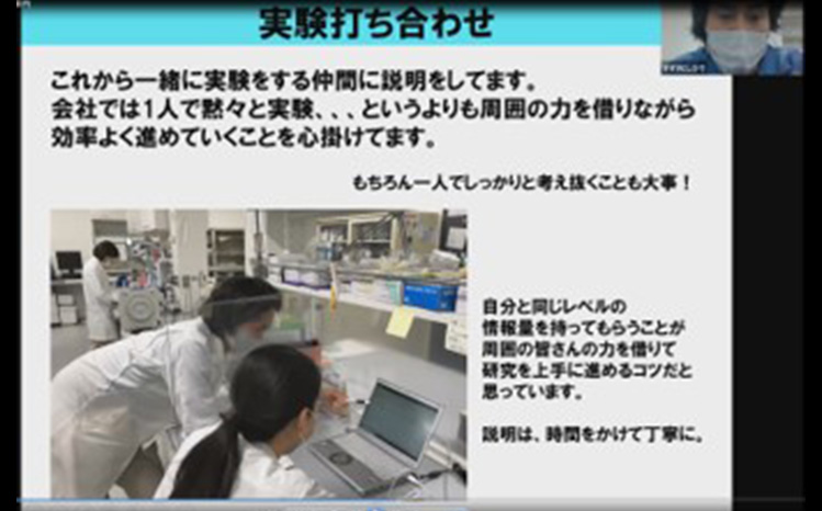 2020年度は新型コロナウイルス感染拡大の状況を踏まえ、オンラインで3日間のインターンを実施した。 現場社員によるラボ紹介や座談会、そして実際に研究員が取り組んでいるテーマへの提案とマネジャーからの真剣なフィードバックを通して、サントリーの研究の幅広さを存分に体感してもらった。