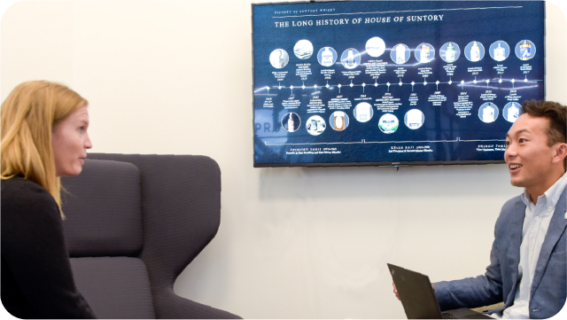 海外で働いてみて感じるのは、まだまだ「Suntory」が世界で勝負していくためにやるべきこと、やりたいことがたくさん残されているということです。日本で「サントリー」と言えば、「烏龍茶」「角瓶」「プレモル」など、高品質でおいしい商品イメージを持たれたり、「やってみなはれ」に代表されるポジティブな企業理念が連想されたりしながら、幅広い世代の方々に愛されています。