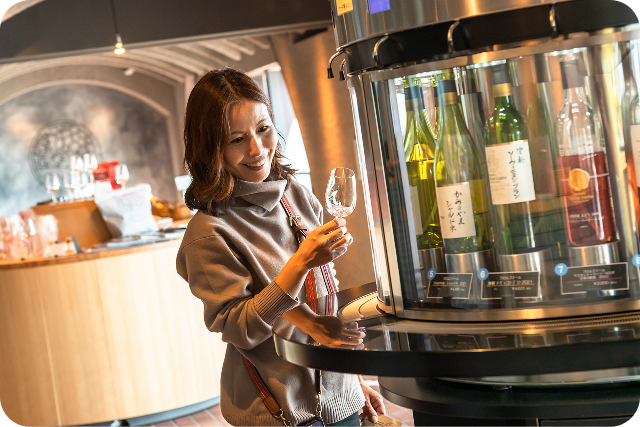 熟成庫ツアーの最後は、出発点となったテラスに併設されているワインショップで、登美の丘ワイナリーをはじめ日本各地のつくり手が丹精込めた日本ワインのテイスティングです。飲み比べをすることで、品種や産地により違う「テロワール(ぶどう畑の土壌、地形、畑ごとの微妙な気候の差など、ワインづくりに影響をあたえる自然の要素)」を体感できます。