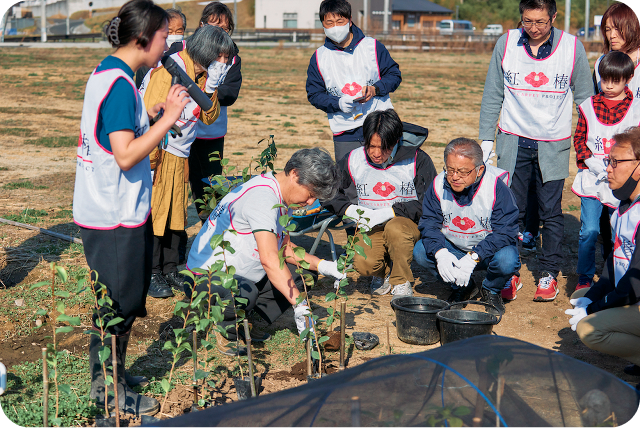 また2年前からは、地元中学の卒業生たちによる記念植樹を実施。故郷を思い出す一助になればと、卒業生全員に自らの名前をつけた苗を植えてもらっています。