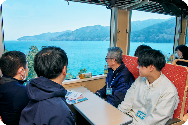 ツアーの最初の行程は、岩手県三陸沿岸を走る三陸鉄道に乗って、出発駅の盛(さかり)駅から釜石駅まで約36.6kmの道のりを「震災学習列車」で往復。サントリーの企業精神を体現する「やってみなはれ」のヘッドマークを掲げた特別列車に乗り込み、盛駅を出発します。