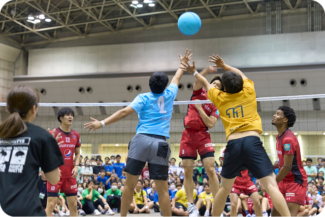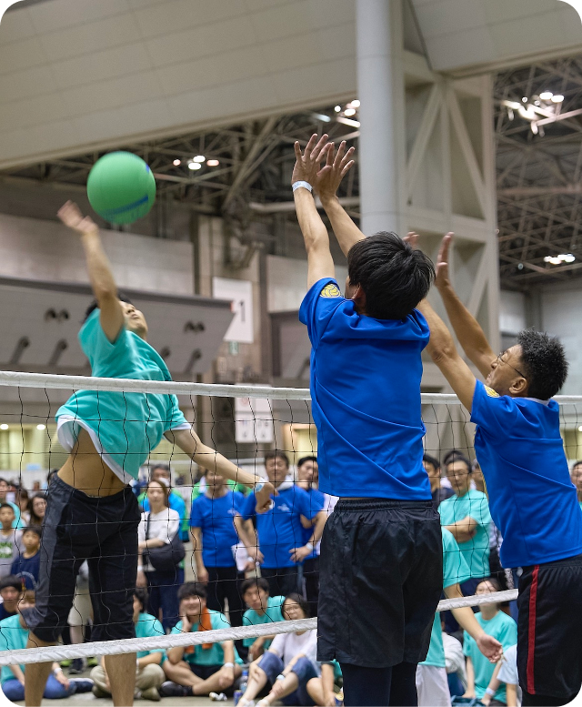 「サントリーソフトバレーボール大会」とは、サントリー全グループ会社社員を対象とした年に一度の一大イベント。例年、大勢の参加者がネットを挟んで熱戦を繰り広げます。さらに、試合以外にも充実した飲食コーナーや、家族で楽しめる体験ブースなど、サントリーグループが一堂に会し「One Suntory」を体現する象徴的なイベントです。