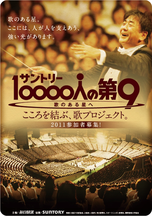 2011年の東日本大震災の際には、サントリーの震災復興支援活動の一環として被災地の合唱団を大阪城ホールに招待。仙台会場に集まった現地の合唱団とも中継で結ばれ、鎮魂と復興の願いが込められた1万人の歌声は、多くの被災者の心を支えました。
