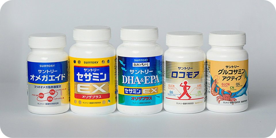 サントリーウエルネスのサプリメント。Comadoはこれらのリアルアセットをご購入いただいているお客様向けのサービスで、サプリメントの摂取とデジタルによる健康管理の両軸で、クオリティオブライフの向上を目指す。