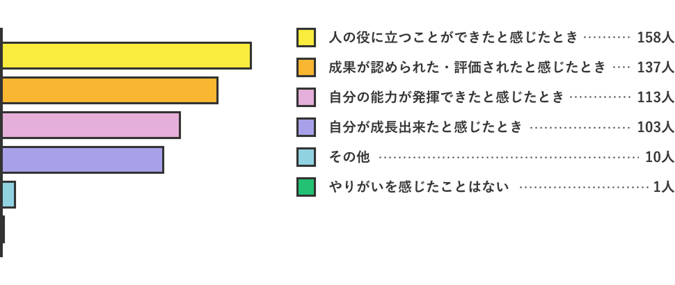 「人の役に立つことができたと感じたとき」「成果を認められた・評価されたと感じたとき」が上位にきているのは、そういった価値観が浸透しているからかもしれません。