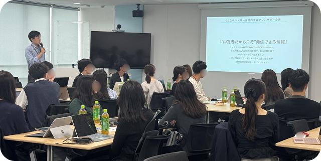 - サントリーを志望する就活生に向けて、内定者視点でサポートできる良い機会になりました。また、同期との交流もでき、とても充実した一日でした。