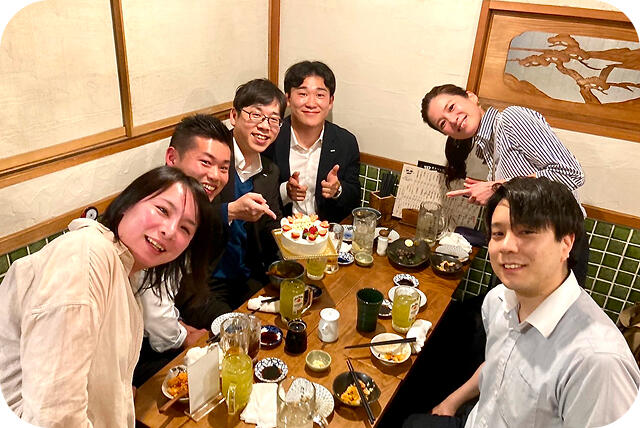現在のチームメンバーと打ち上げ。この日はメンバーの誕生日会を開催。