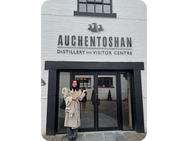 視察のため、スコットランド ローランド地方のオーヘントッシャン蒸溜所へ出張。国内の蒸溜所との違いを現地社員から直接レクチャーしてもらい、学びが多かったそう。