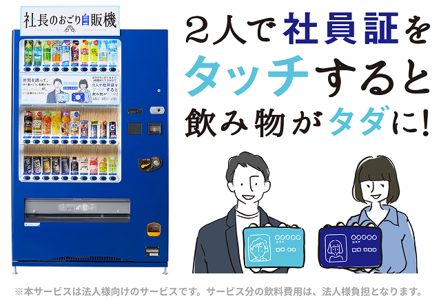 「社長のおごり自販機」は、2人の従業員が社員証を同時にタッチすると無料で1本ずつ飲料を受け取ることができる法人向け自販機サービスです。従業員同士のコミュニケーション不足が課題となる昨今、「社長のおごり自販機」が提供する新しいコミュニケーションの形が注目を集めています。
