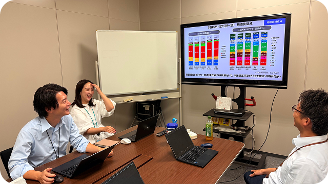 篠崎さん:営業部署と対得意先向けに組んでいるチームでは、メンバー同士がどのような動きを取っているのかを日々共有し、ワンチームとして、柔軟に協力しながら仕事をしています。一人では100点以上の結果を出すことはなかなか難しいですが、チームの連携があるからこそ、100点+αを目指すことができ、地方のサントリー商品シェア拡大に向け、ひたむきに取り組み続けることができるのだと思います。