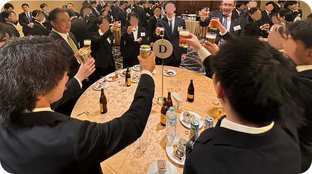 内定式後の懇親会では、サントリーならではの「スコール」で乾杯!