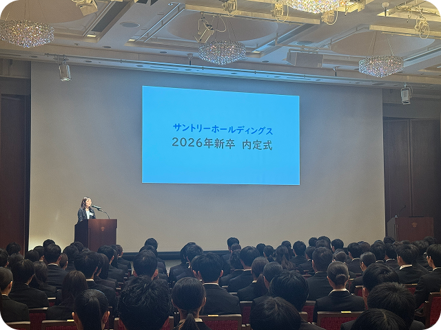 2025年10月1日、サントリーホールディングス株式会社の内定式を執り行いました。本記事では、来年春に入社予定の200名を超える内定者が一堂に会した内定式と、内定式後に開催された懇親会の様子をお届けします。