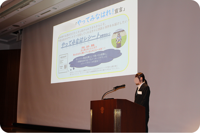 Bさんは、レシートにエールを込める「やってみなはレシート」というアイデアを発表しました。挑戦するそばにいつも飲料があったという自身の経験をもとに、頑張るすべての人にエールを届けたい、誰かの挑戦を応援できる存在になりたいという想いを語りました。
