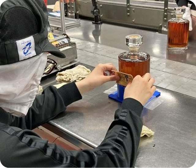 山崎をはじめとするプレミアムウイスキーの瓶詰工程で、設備のメンテナンスやトラブル対応などの保全業務を担当しています。ウイスキーを瓶に充填し、ラベルを貼り、包装する瓶詰工程は、長い年月をかけて育まれたウイスキーを製品として世に送り出す、ウイスキーづくりの最終段階。私たちは、「お客様から美しいと言われるほどの美装」を「山崎品質※」の1つとして掲げ、外観の細部にまでこだわり抜いた製品づくりに日々取り組んでいます。