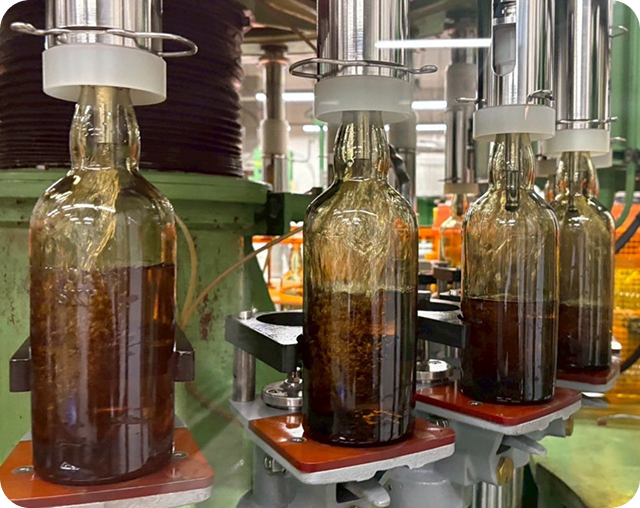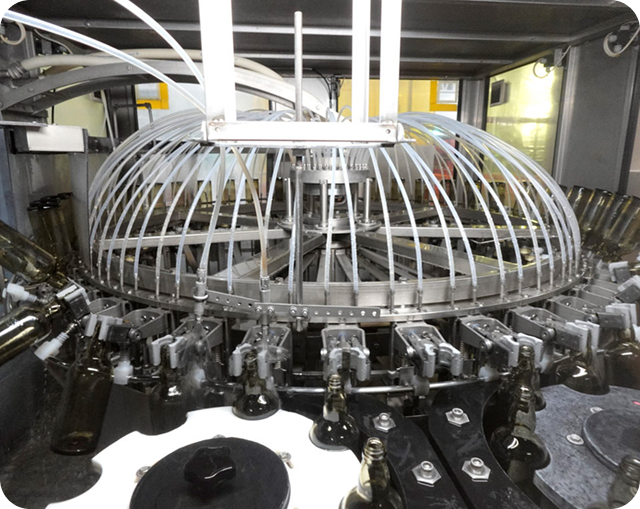 空の瓶をコンベヤーにセットし、水で内部を洗浄します。洗浄後は瓶の口を下に向けて水を切り、内部に水が残らないようにします。その後、瓶に傷が付いていないかを光を当てながら検査します。キャップを締めると口部の傷は見えなくなってしまうため、この段階では特に口部の確認が重要です。