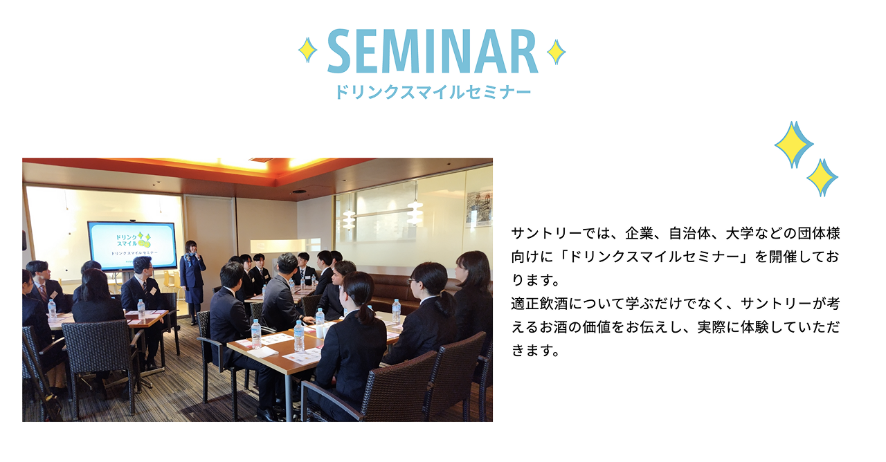 サントリーは法人向けだけでなく、さまざまな自治体や大学などでも「ドリンクスマイルセミナー」を実施。