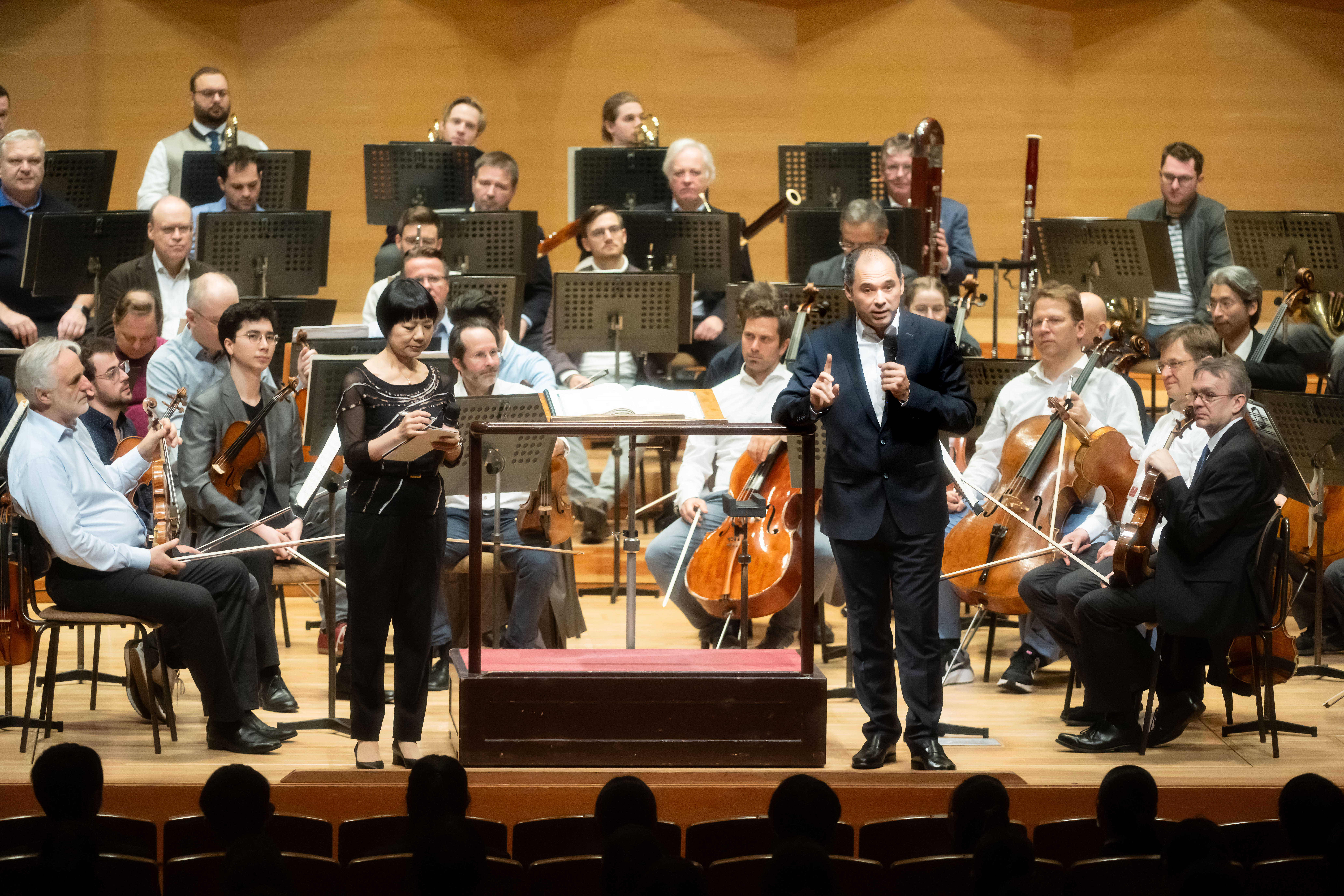 昨年の「サントリーホール&ウィーン・フィルの青少年プログラム」。指揮者のトゥガン・ソヒエフが舞台から語りかけます。©N. Ikegami | SUNTORY HALL
