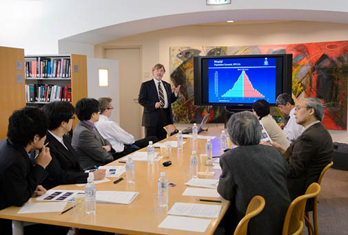 まず、世界的に著名な人口学者で、ベストセラーBoom Bust & Echo: How to Profit from the Coming Demographic Shift (1997)の著者デイヴィッド・フット教授(トロント大学)が「高齢化―人口動態の利害得失を解きあかす」と題して報告を行った。フット教授はイギリス出身で、オーストラリアにて育ち、現在はカナダに居住している。こうしたバックグラウンドを示す意味もあって、フット教授は“ageing”というイギリス式のつづりをタイトルに用いている。