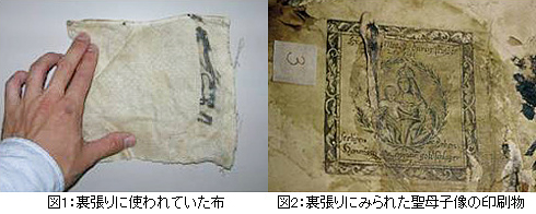 第2の課題である日本からオーストリア・グラーツにいたる経路と、現地での屏風の利活用については、以下の諸点が議論された。(1)グラーツでの調査により、「豊臣期大坂図屏風」はエッゲンベルク侯3代目のヨハン・ザイフェルトが購入し、その時期は1665年から1679年までの間であることが確認された。(2)屏風が現在見られるように8枚のパネルに分割され、エッゲンベルク城「日本の間」に飾られることになったのは、ヨハン・ザイフェルトの孫娘マリア・エレオノラがエッゲンベルク城をロココ調に改装した18世紀中頃のことと考えられる。(3)ヨハン・ザイフェルトが本屏風を購入した時期から推測すると、日本からオーストリアへ屏風が渡ったルートはオランダ・東インド会社経由である可能性が高い。17世紀の長崎オランダ商館長日記や、日蘭貿易船の積載品に関する送り状を精査した結果、屏風が交易品として輸出されたいくつかの事例を見出すことができた。(4)「豊臣期大坂図屏風」に使われていた裏張り文書類を調査したところ、木綿と思われる布が裏張りに用いられていた【図1】。こうした手法は日本ではほとんどみられず、この屏風が8枚のパネルに分割され「日本の間」壁面に嵌めこまれた際の補修であると思われる。また裏張りの中に聖母子像をデザインした印刷物が数点含まれていたことからも、「豊臣期大坂図屏風」がグラーツに渡ったのちに現地でメンテナンスされてきたことを窺うことができる【図2】。こうした現地での補修が、この屏風が制作から約350年の年月を経てなお、これほど良好に保管されてきた理由の一つであると考えられる。