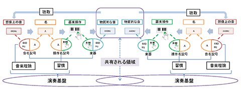 本研究が構築した演奏論的枠組みの概要を次頁に図示する。この図は、二人の奏者が同時に演奏する共演の場を図示している。本研究は、即興演奏を一種の「変換行為」と考え、即興演奏を「その場で思いついた『想像上の音』を、鳴り響く『物質的な音』へ変換すること」と規定する。想像上の音が物質的な音へと変換されるには「楽器」と「記号」という媒介者が必要である。楽器は、奏者の身体的動作(これを「器楽操作」と呼ぶ)を物質的な音へと変換する媒介者である。一方、想像上の音を器楽操作へ変換するには、想像上の音を器楽操作と対応させる能力を有していなければならない。こうした対応付けの能力は記号化の能力であり、奏者はこの能力を、実際に楽器で音を出すことを繰り返すことで身に付ける。