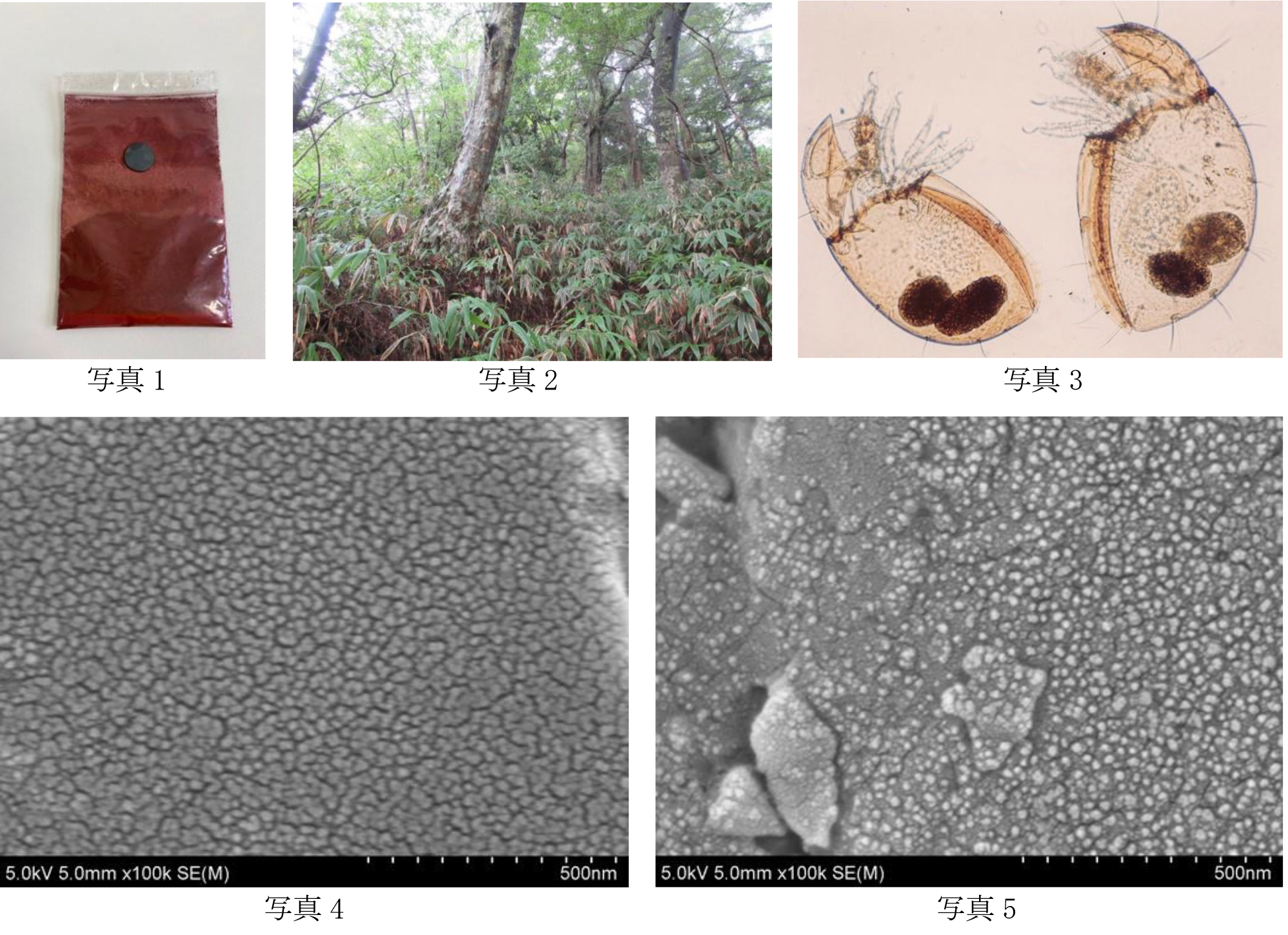 酸化鉄の緻密焼結体ペレットサンプル(写真1)を自然林(例えば和泉葛城山のブナ原生林:写真2)や植林地等の土壌に一定期間埋設し、酸化鉄の生物風化を評価することで、森から海への鉄分の供給量(=魚つき林の効果)の定量的解析を試みた。生物風化とは土壌動物(例えばササラダニ:写真3)や微生物が有機物を分解する際に生じる酸が鉱物を溶かす現象である。写真4はブナ原生林(写真2)の土壌に、写真5は原生林の周辺にあるスギ植林地(人工林)の土壌に、それぞれ約1ケ月埋設したサンプルの高分解能電子顕微鏡写真である。表面の凹凸状態(ザラザラした感じ)がブナ原生林の方が大きく、原生林の方が植林地(人工林)よりも生物風化が進行していることが示唆された。また、ブナ原生林とスギ植林地(人工林)の生物多様性をササラダニ(写真3)の種の数で評価した結果、原生林は67種、植林地(人工林)は28種であり、原生林の方が優れていることが分かった。以上により、原生林の土壌の持つ優れた生物風化機能と豊かな生物多様性が実験的に確認できた。