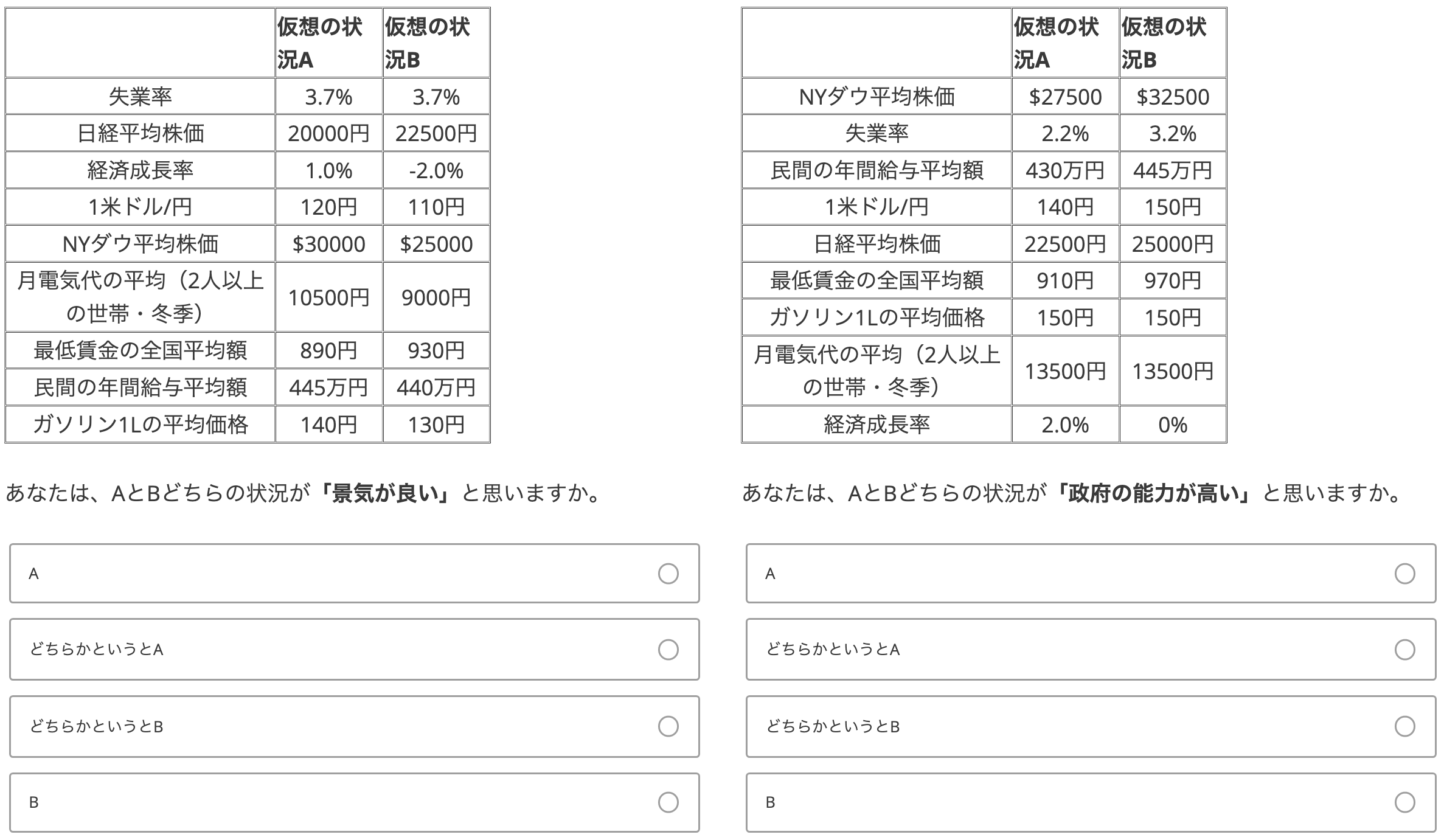 2023年2月に楽天インサイト社に依頼しオンライン世論調査を行った。この調査には株価や経済成長率などの経済指標の組み合わせによる2つの仮想の経済状況から、「景気が良い」または「政府の能力が高い」ものを選択させるコンジョイント実験を含んでいる。さらに、選挙での投票先や投資品目・保有資産などの項目を設け、コンジョイント実験の結果のサブグループによる違いや、投票行動の分析を行えるようにしている。