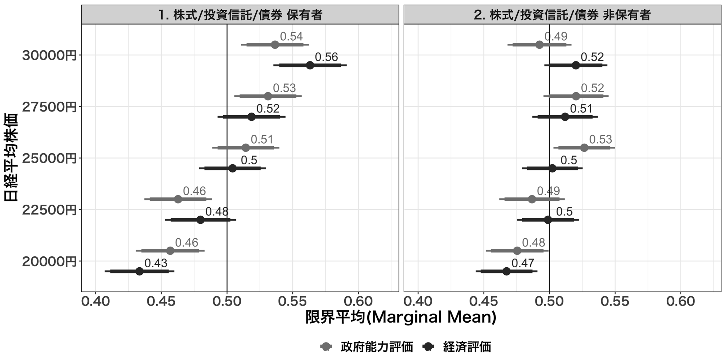 コンジョイント実験の結果、株式・投資信託などのリスク資産を保有する有権者は、そうでない有権者に比べ、日経平均株価を景気・政府の能力の両方の評価により強く反映していた。この傾向は、投票政党によるサブグループで見た際、立憲民主党投票者よりも自民党投票者・維新の会投票者・棄権者により近いものであった。実験以外の質問項目からは、自民党・維新の会への投票確率や政権担当能力評価を有意に高めるが、立憲民主党への投票や評価には有意な効果を持たないことが示された。加えて、リスク資産保有は投票参加確率を高めており、この種の有権者が比率以上に選挙を左右すると考えられる。