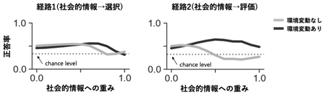 上記の2つの経路を計算論モデル(Najar et al., 2020)によりモデル化し、シミュレーションを行った。このシミュレーションでは、それぞれの社会的情報の学習アルゴリズムを備えた集団を用意し、どちらのアルゴリズムにおいて誤った情報源の選択確率が高まりうるかを調べた。その結果、第一の経路(社会的情報→選択)では、環境変動(情報の正しさの「ゆらぎ」)の有無によらず、社会的学習の結果として比較的頑健に正しい情報源が選択されるように集団の学習が進むことが分かった。その一方、第二の経路(社会的情報→評価)では、環境変動がある場合には、社会的学習により正しい情報源が選択されやすくなった一方、環境変動がない場合には、人々が誤った情報源に偏って選択するようになった。