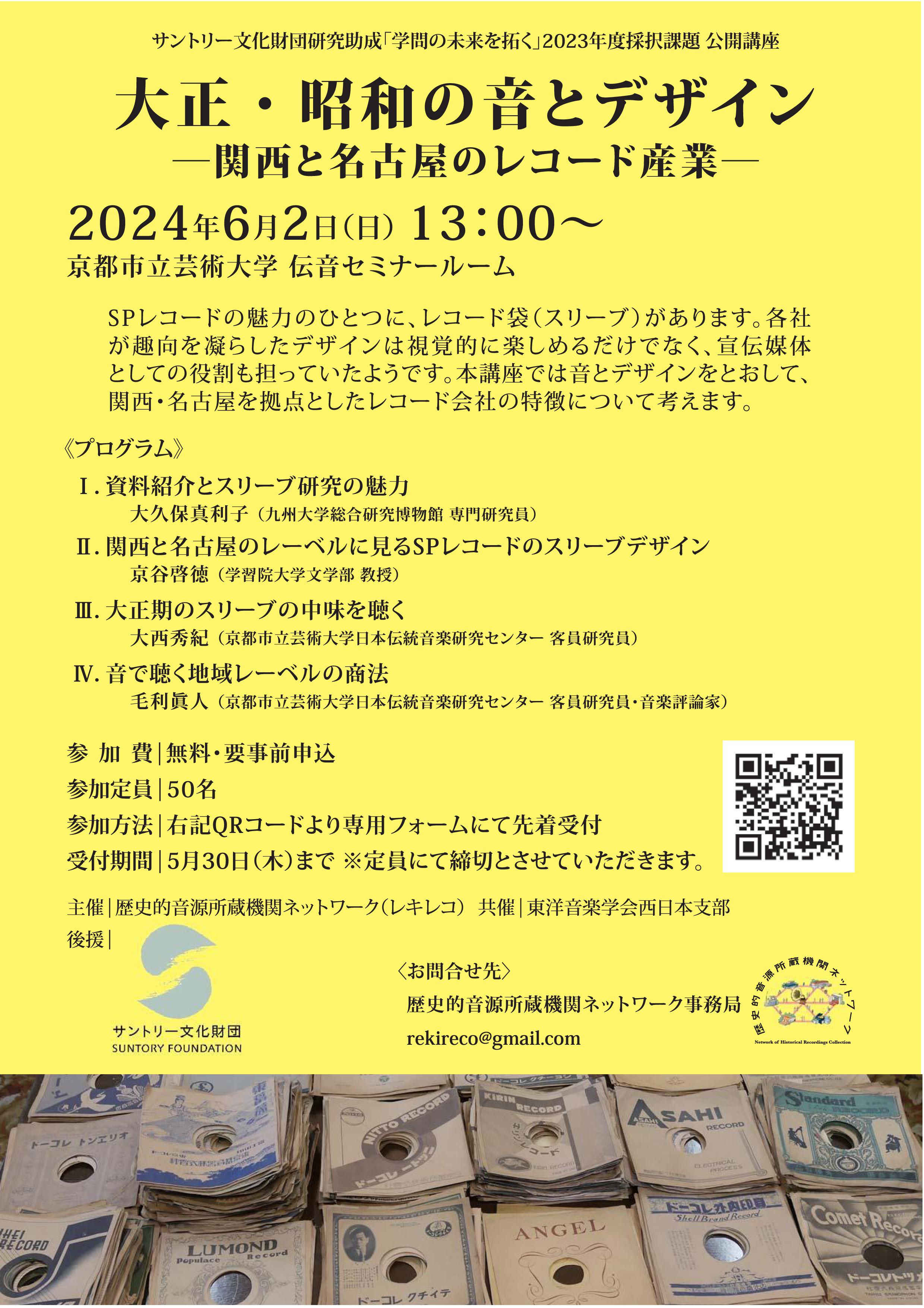 スリーブはSPレコード関連資料のなかではデザイン的に非常に興味深い資料である。しかし先行研究は数例しかなく、本研究に取り組むにあたり主に九州大学総合研究博物館が所蔵する約4万枚のSPレコードに対応するスリーブの整理からはじめた。そうしたところ関西や名古屋に拠点をおくレコード会社のスリーブは、専属演奏家の顔写真、自社製品(蓄音機や針)の広告、宣伝文句など記載事項が多く、コンテンツによってスリーブを作り変えて多くのバリエーションを作成するなど、スリーブを販売戦略に用いる傾向が認められた。そこで関西・名古屋に拠点をおくレコード会社約30社を対象として整理を進め、500点あまりのデジタル資料化に取り組んだ。詳細は論文(大久保真利子「SPレコードのスリーブに関する一考察―田村悟史コレクションを事例とした整理と研究」『九州大学総合研究博物館研究報告』第21号,pp.113-119,2024)にて発表するとともに、公開講座「大正・昭和の音とデザイン―関西と名古屋のレコード産業―」を実施し、研究メンバー4名による講演のほか、スリーブに関するミニ展示を行い、好評を得た。